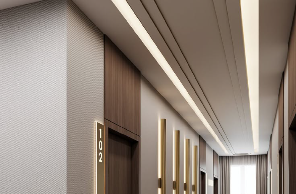 The Lumina Grand Hotel indoor lighting design focuses on creating a luxurious and welcoming atmosphere throughout the building, balancing elegance, functionality, and energy efficiency. The lobby features grand chandeliers, suspended linear lights, and recessed downlights to ensure a layered and visually striking environment, highlighting architectural features and key focal points. Corridors are softly illuminated using wall sconces and cove lighting, providing safe navigation while maintaining a warm and inviting ambiance. Guest rooms incorporate recessed ceiling downlights, bedside reading lamps, and accent wall lighting, allowing guests to adjust the mood and brightness according to their preference. Restaurant and bar areas are enhanced with pendant fixtures, track-mounted spotlights, and indirect cove lighting to create intimate zones and highlight decorative elements. Conference and meeting rooms utilize dimmable LED panels and recessed downlights, ensuring optimal illumination for presentations and gatherings. All lighting systems employ energy-efficient LEDs with smart controls and dimming capabilities, promoting sustainability while delivering a comfortable and elegant experience. The overall design unifies aesthetics and function, enhancing the hotel’s identity as a premium hospitality destination.