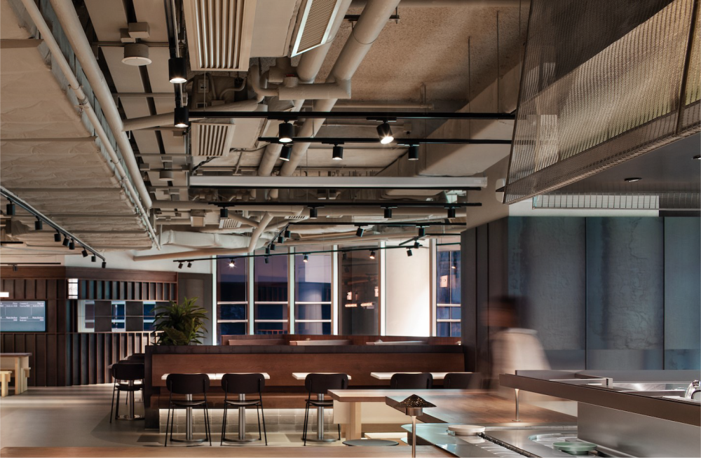Aurora Luxe Hotel’s lobby features a layered lighting concept with recessed downlights providing uniform ambient illumination, complemented by adjustable ceiling-mounted spotlights that highlight artwork, feature walls, and the reception area. Suspended linear downlights define circulation zones, while wall-mounted accent lights enhance textures and architectural details. The combination of spotlights and downlighting creates a dynamic yet elegant environment, offering both functionality and visual impact for arriving guests.