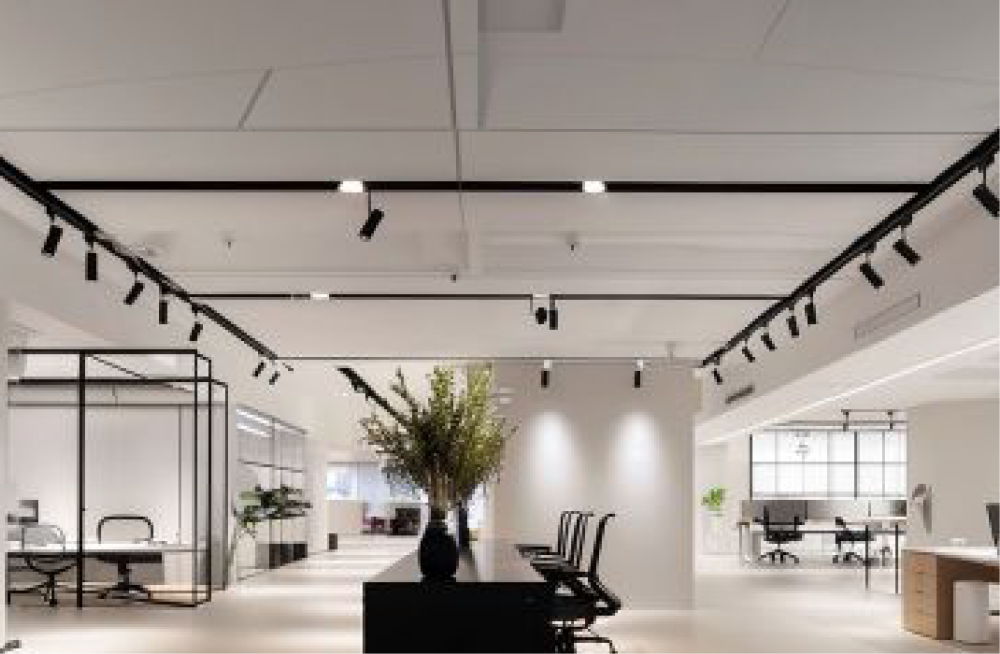 Focus Point Offices implements a modern and flexible lighting solution using ceiling-mounted and track-mounted spotlights to enhance visual hierarchy and workspace functionality. Adjustable LED spotlights are positioned to illuminate individual workstations, collaborative zones, and meeting areas, providing precise task lighting without causing glare. In open-plan areas, directional spotlights highlight architectural features, branding elements, and decorative walls, creating a dynamic and engaging environment. Corridors and reception areas are softly accentuated with angled spotlights to guide circulation while emphasizing textures and design details. The meeting rooms incorporate spotlights with tunable white LEDs, allowing color temperature adjustments to support focus during presentations or relaxation during breaks. All fixtures use high-efficiency LEDs with precise beam control and dimming capabilities, ensuring energy savings while maintaining visual comfort. The overall lighting design delivers a contemporary, adaptable, and professional office atmosphere that balances productivity, aesthetics, and flexibility.