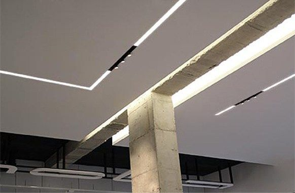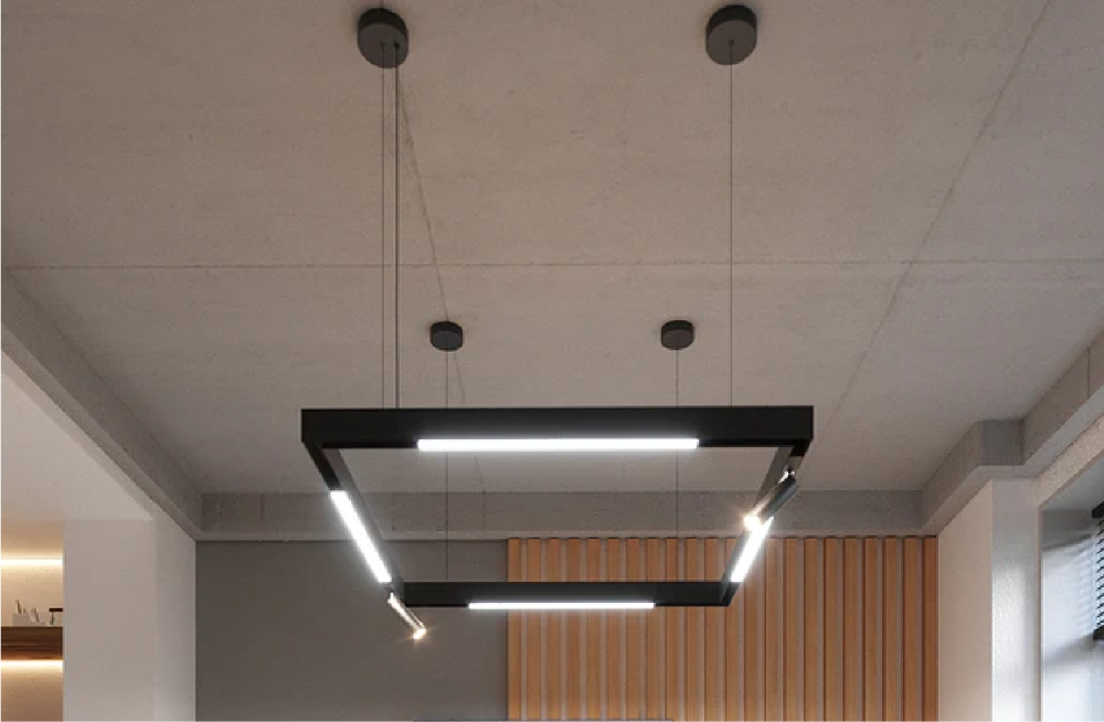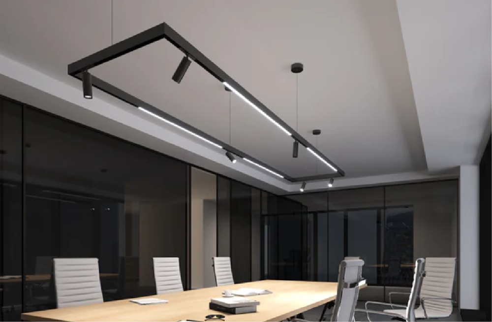 LumaFlex Offices features a versatile lighting design centered around adjustable LED spotlights to create a professional, visually engaging workspace. Track-mounted spotlights are installed throughout open-plan areas, directing focused light onto workstations, collaborative zones, and display panels without causing glare. Recessed ceiling spotlights highlight architectural details, feature walls, and branding elements, adding depth and visual interest to the office environment. Meeting rooms use dimmable spotlights with tunable white LEDs, allowing staff to adjust brightness and color temperature for presentations, discussions, or creative brainstorming sessions. Reception and lounge areas are enhanced with accent spotlights to draw attention to decorative elements and textured surfaces. All fixtures are energy-efficient and integrated with smart control systems, ensuring flexibility, sustainability, and optimal illumination throughout the office. The design combines precision, adaptability, and modern aesthetics, supporting productivity while emphasizing a sleek, professional atmosphere.